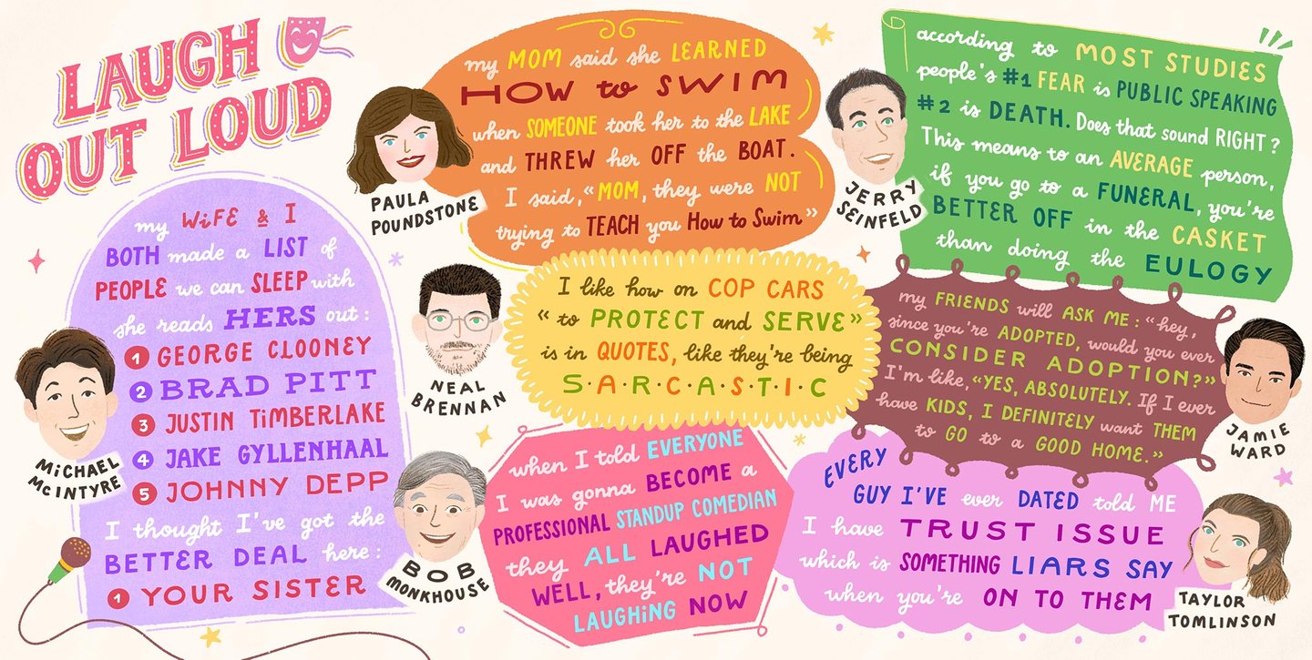 Words by Michael McIntyre, Paula Poundstone, Neal Brennan, Bob Monkhouse, Jerry Seinfeld, Jamie Ward, Taylor Tomlinson.