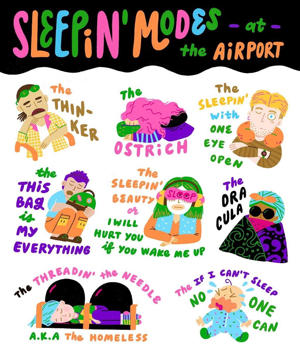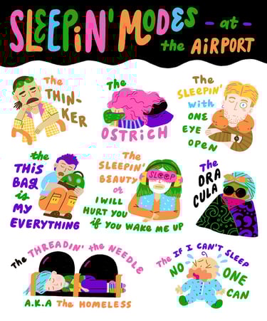 A sticker series born from my endless layovers and terminal fatigue, featuring travelers of all shapes and sizes — united in their desperate quest for horizontal salvation.