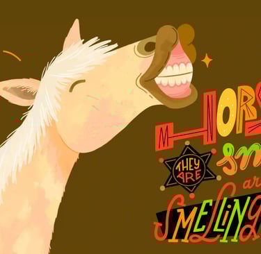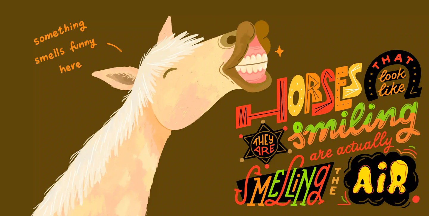 That "smiling" horse? Total olfactory illusion. While his toothy grin might suggest equine joy, he’s actually just catching a whiff of something… questionable.