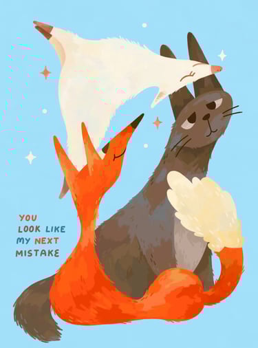This one was more obvious: a mountain (or dune) shape, a few birdies, and two faces staring at them with suspicion. But simplicity brings its own challenge: why are they looking, and with such an attitude, no less?
