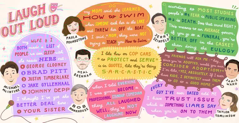 Words by Michael McIntyre, Paula Poundstone, Neal Brennan, Bob Monkhouse, Jerry Seinfeld, Jamie Ward, Taylor Tomlinson.