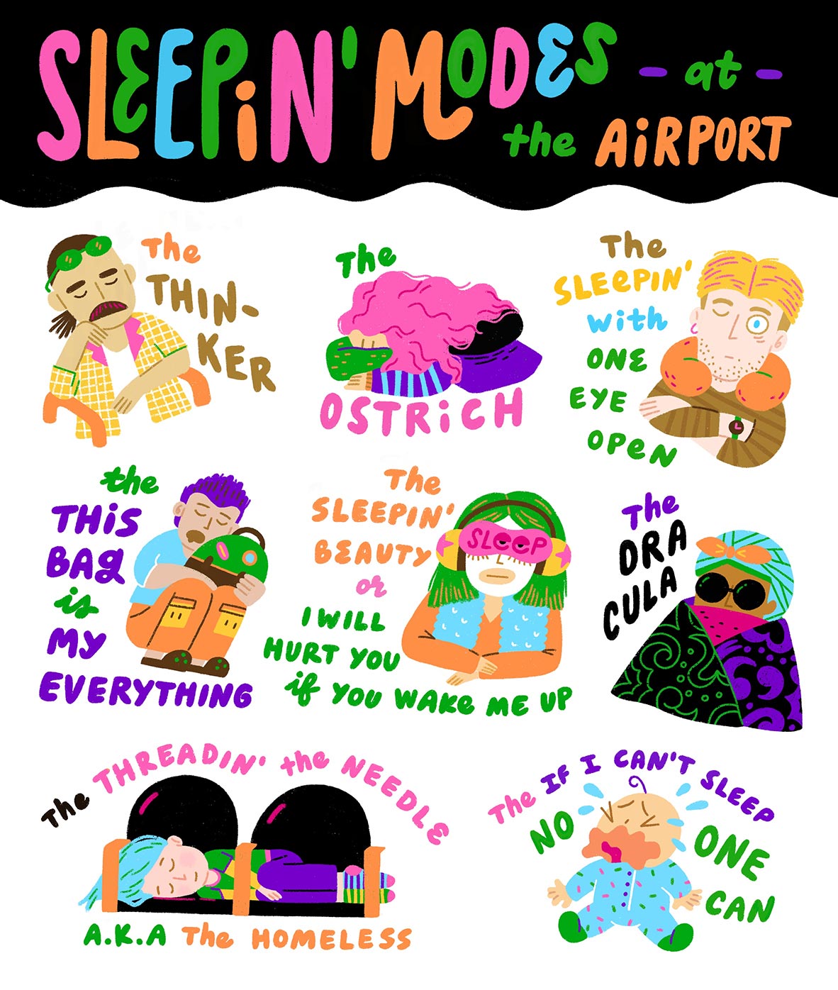 A sticker series born from my endless layovers and terminal fatigue, featuring travelers of all shapes and sizes — united in their desperate quest for horizontal salvation.