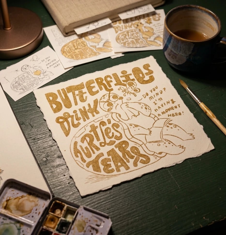 That last part feels deeply suspicious. So this artwork imagines one turtle who does mind – very much – his electrolyte freeloaders.